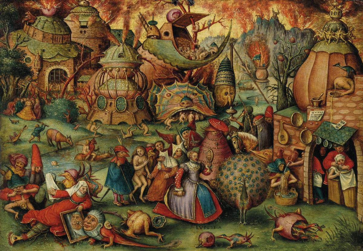 Reproduction of “Allegory of Pride” by Bruegel the Elder. A Flemish oil painting rich in symbols and details about the sin of vanity.
