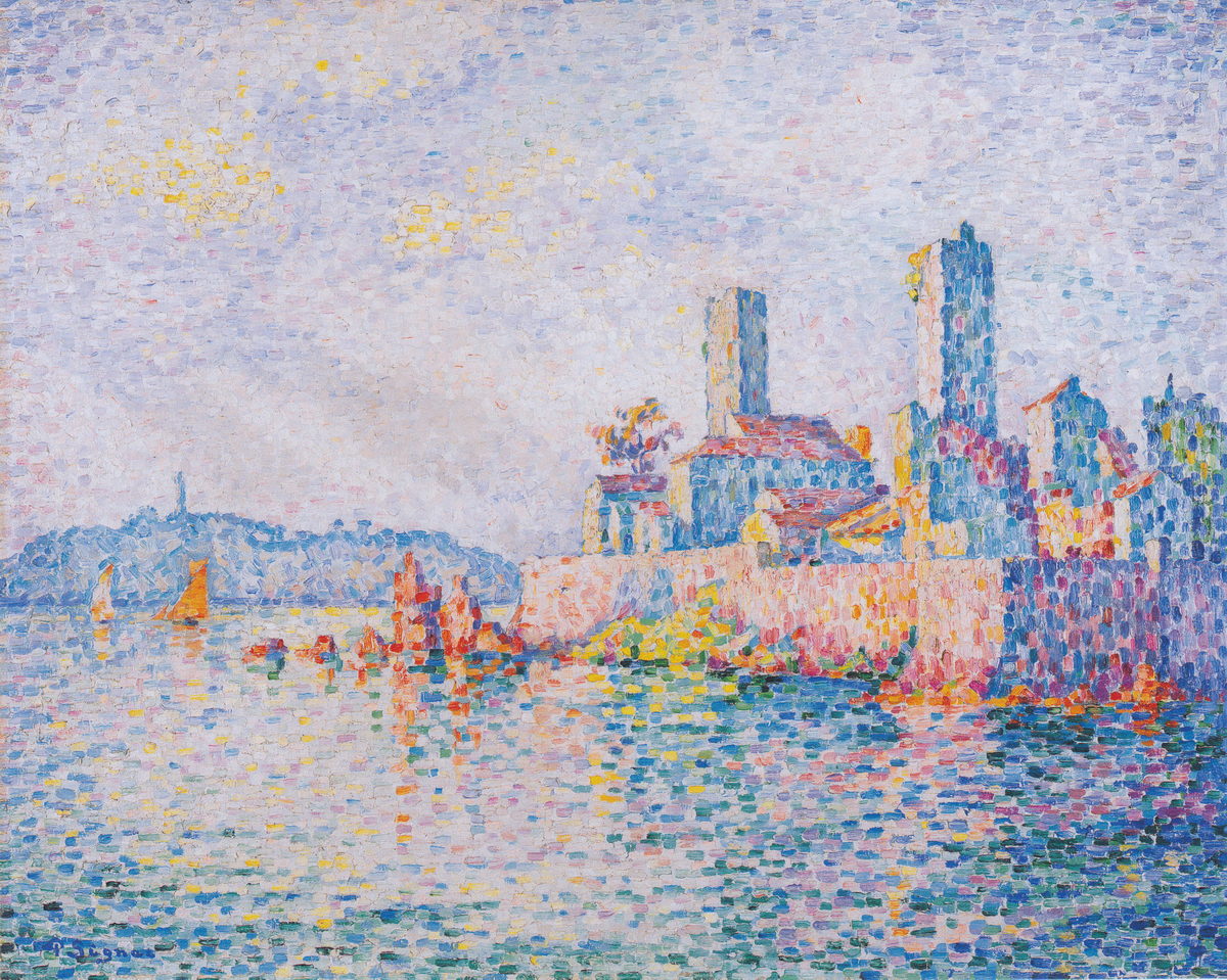 Reproduction of The Towers of Antibes by Signac, a pointillist canvas with soft colors.