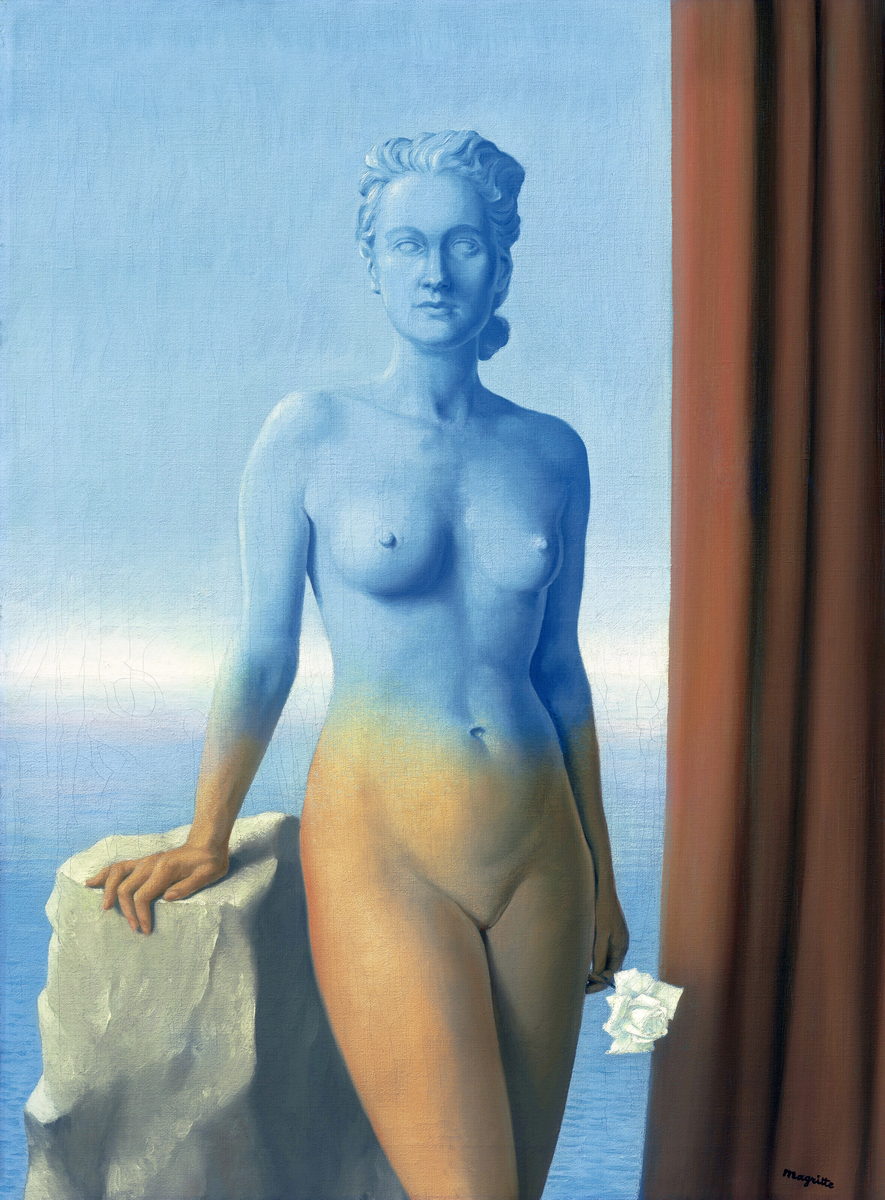 Change your decor with “Black Magic 2” by Magritte. A surrealist painting reproduction of a sky-woman holding a rose. Hand-painted.
