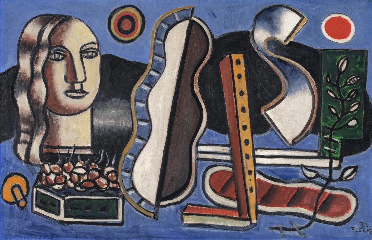 Reproduction of “Contrasting Objects on a Blue Background” by Fernand Léger. A modern abstract still life featuring a face and biomorphic shapes.