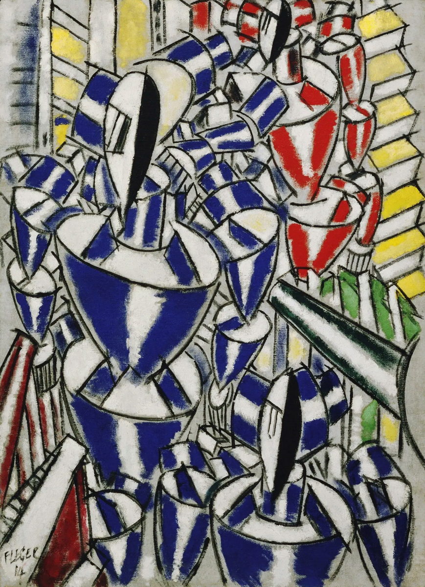 Reproduction of “Exit the Ballets Russes” (1914) by Fernand Léger. A dynamic and mechanical Cubist painting, capturing the energy of dance.