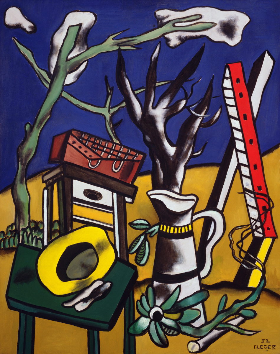 Reproduction of “Landscape with Yellow Hat” by Fernand Léger. A vibrant still life within a landscape, with pure colors and black outlines.