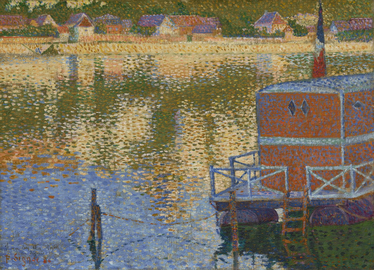 Reproduction of Les Andelys - The Baths by Signac, a study of reflections on water.