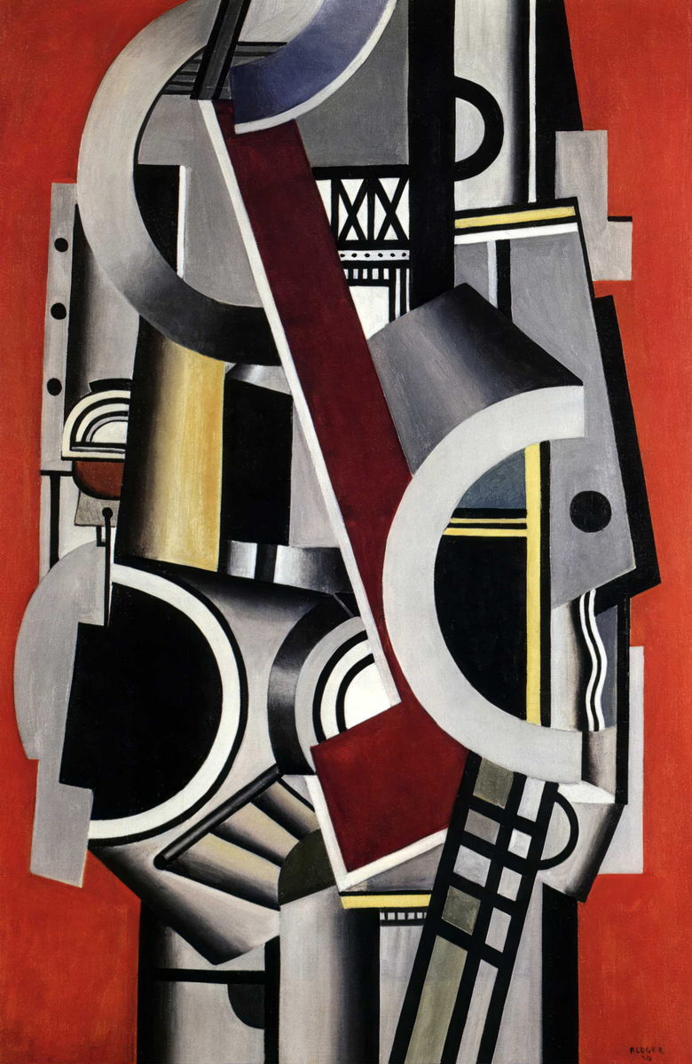 Reproduction of “Machine Element” (1920) by Fernand Léger. An abstract painting from the mechanical period, with geometric forms on a red background.