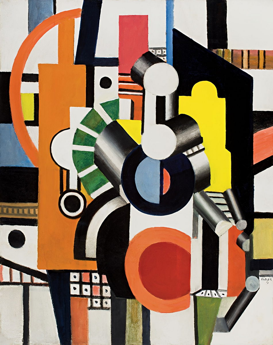 Reproduction of “Mechanical Element” (1924) by Fernand Léger. A Cubist and mechanical work with bright colors (orange, yellow, red) and tubular forms.