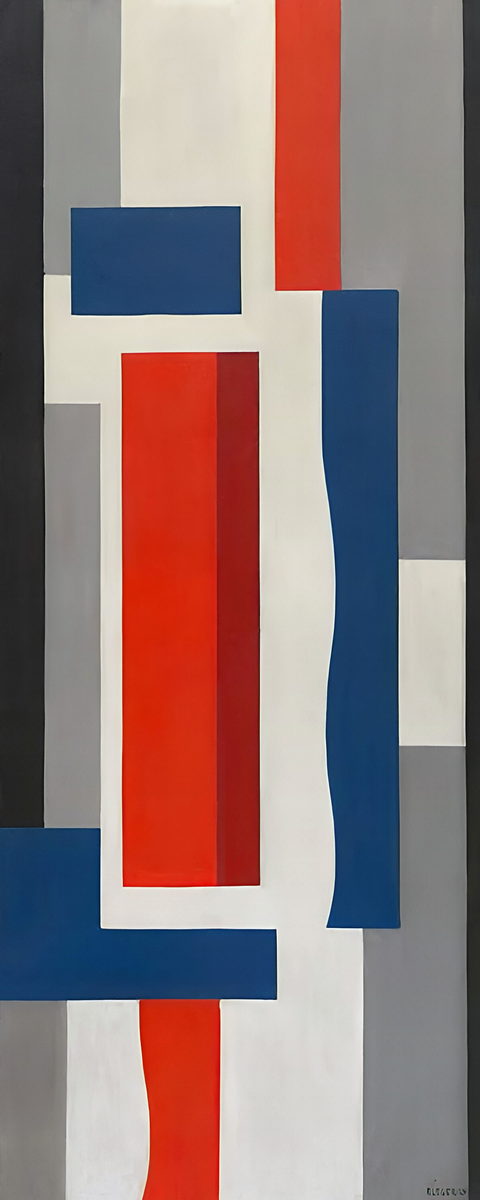 Reproduction of “Mural Painting 2” by Fernand Léger. A vertical abstract composition with pure color blocks (red, blue, gray) and geometric forms.