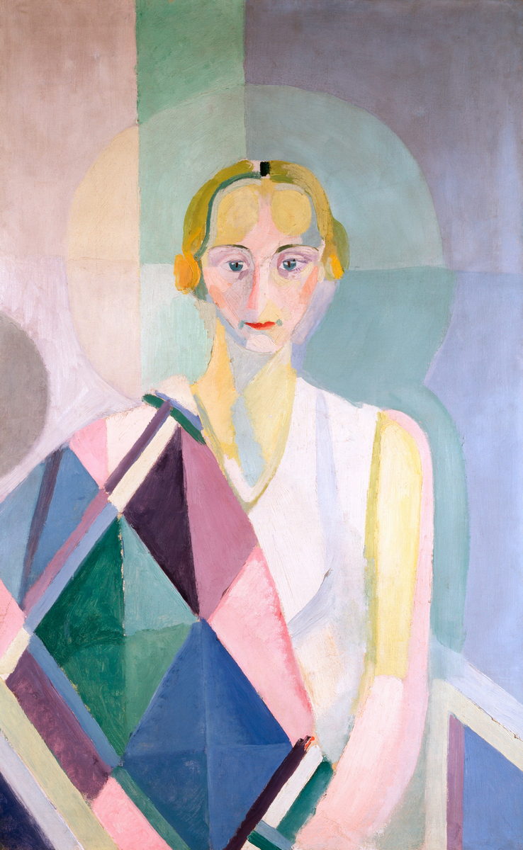 An elegant portrait of Mrs. Heim by Robert Delaunay. An Art Deco style work that combines figuration and colorful geometric patterns.
