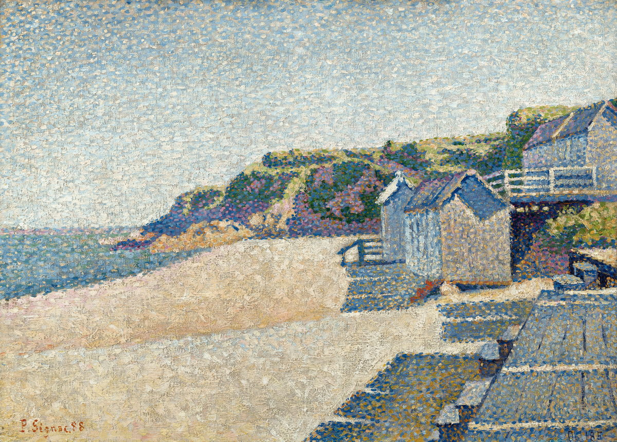Reproduction of Portrieux - The Bathing Cabins by Signac, a Pointillist beach scene.