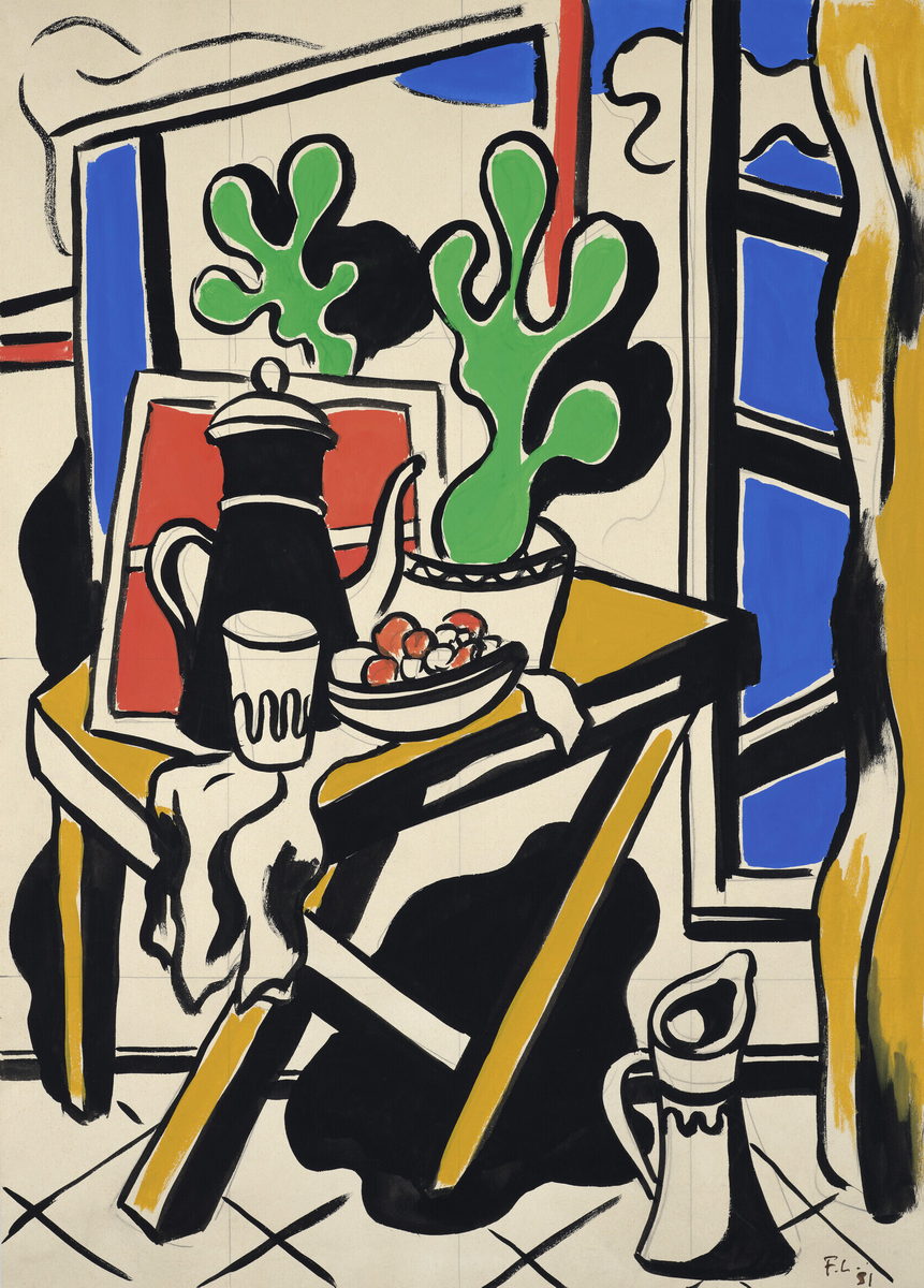 Reproduction of “Still Life in the Kitchen” by Fernand Léger. A modern still life with thick black lines and primary colors.