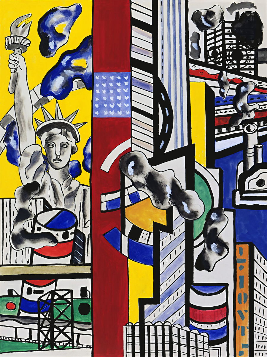 Reproduction of “Study for Cinematic Mural 2” by Fernand Léger. A vibrant composition of New York City, featuring the Statue of Liberty.