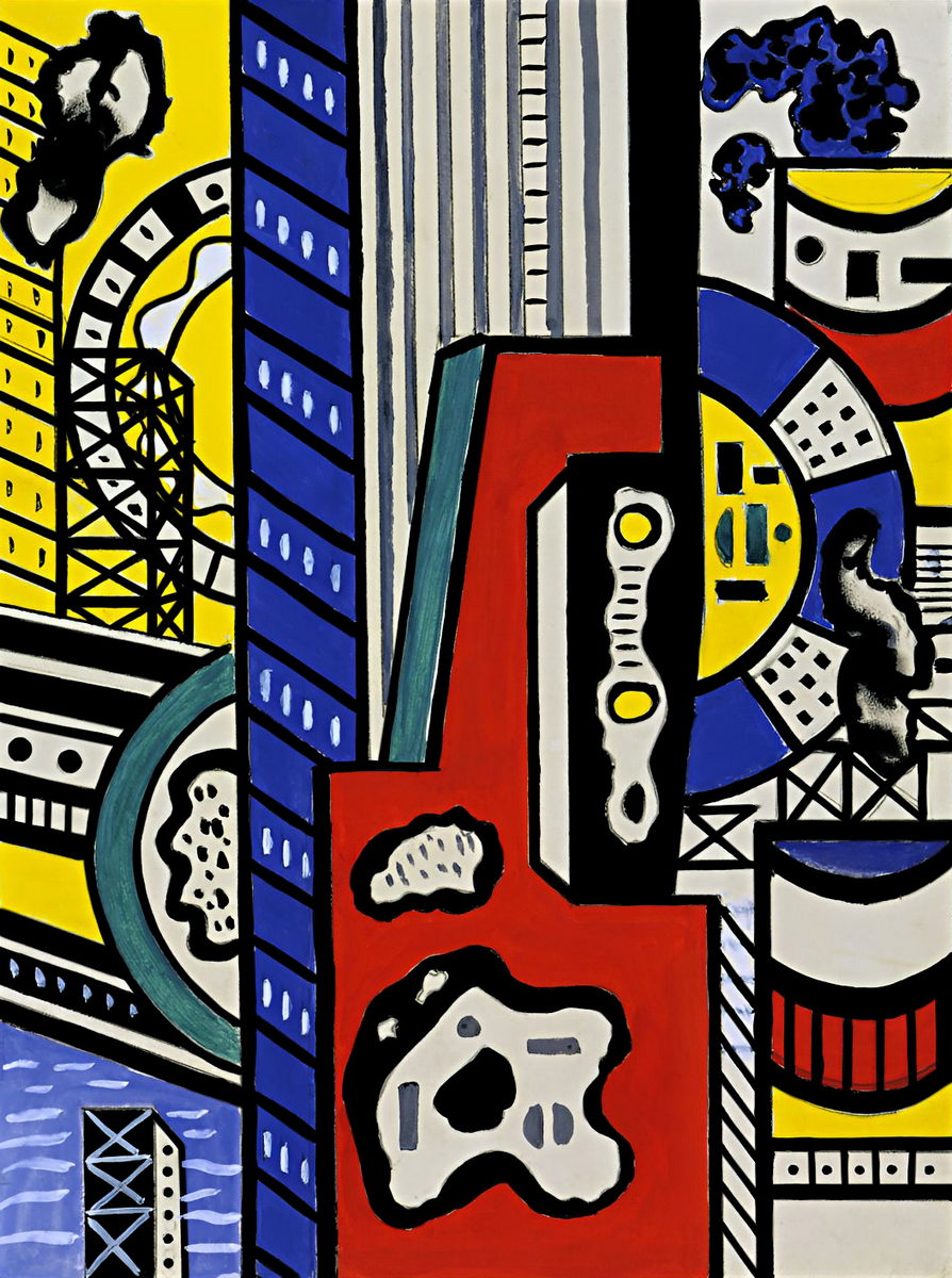 Reproduction of “Study for Cinematic Mural 4” by Fernand Léger. An abstract city composition in red, yellow, and blue.