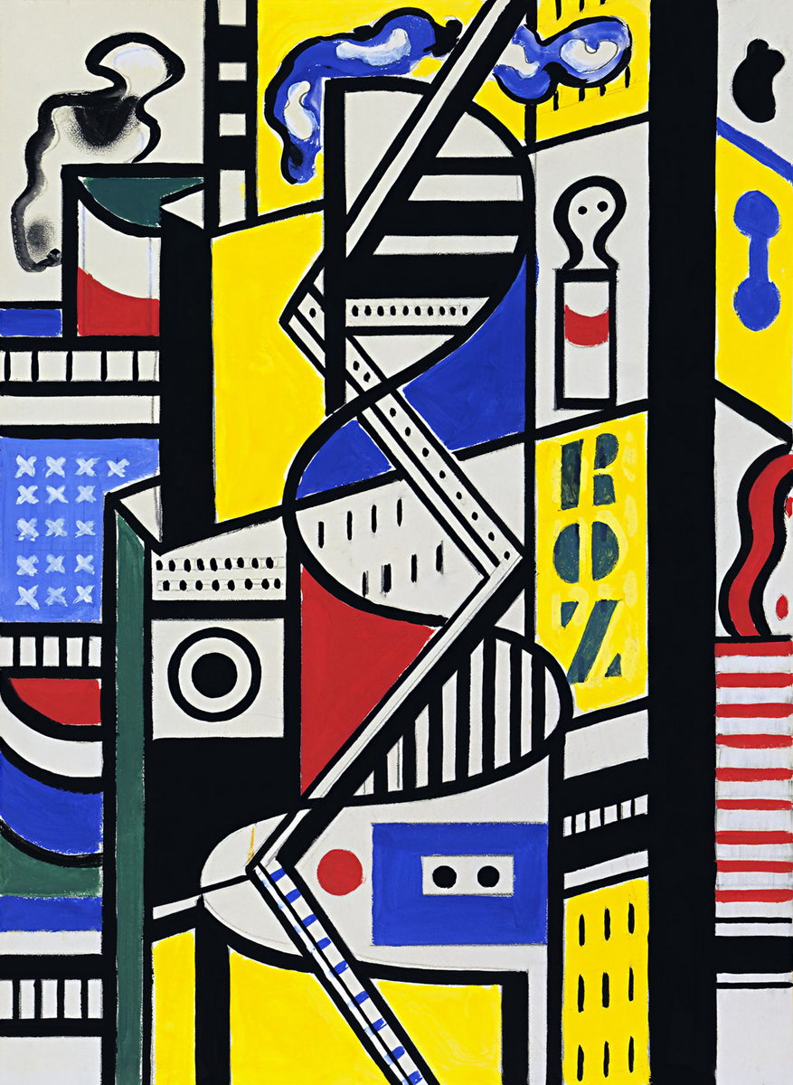 Reproduction of “Study for Cinematic Mural 6” by Fernand Léger. An abstract and dynamic city composition in yellow, blue, and red.