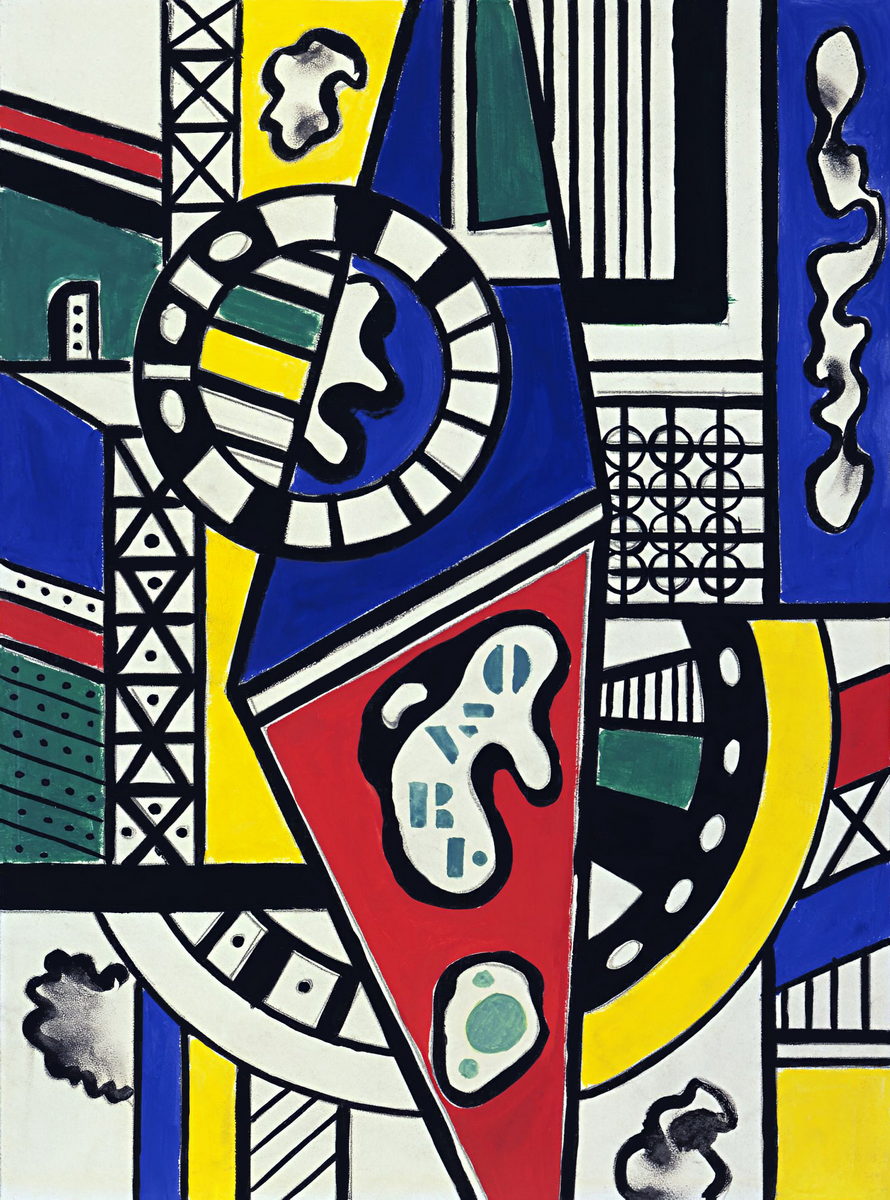 Reproduction of “Study for Cinematic Mural 7” by Fernand Léger. An abstract and geometric work of the city in primary colors.