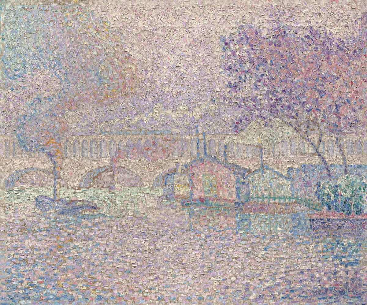 Reproduction of The Auteuil Viaduct by Signac, a Parisian landscape in mauve tones.