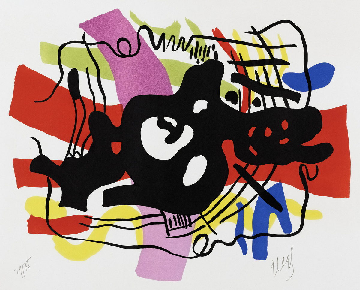 Reproduction of “The Black Root” by Fernand Léger. An abstract and graphic lithograph with bright colors, typical of his late style.