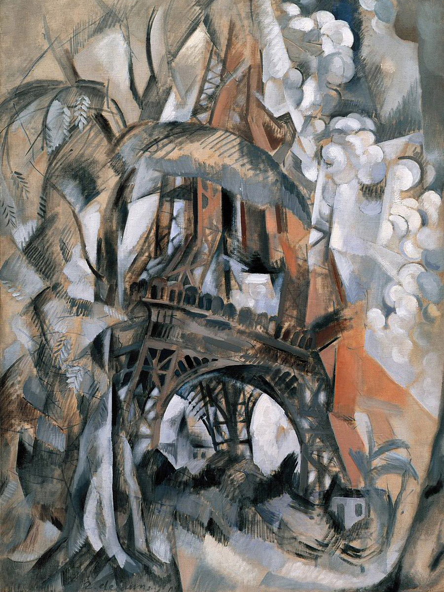 A Cubist painting by Robert Delaunay showing the Eiffel Tower through trees. A complex composition in monochrome tones.