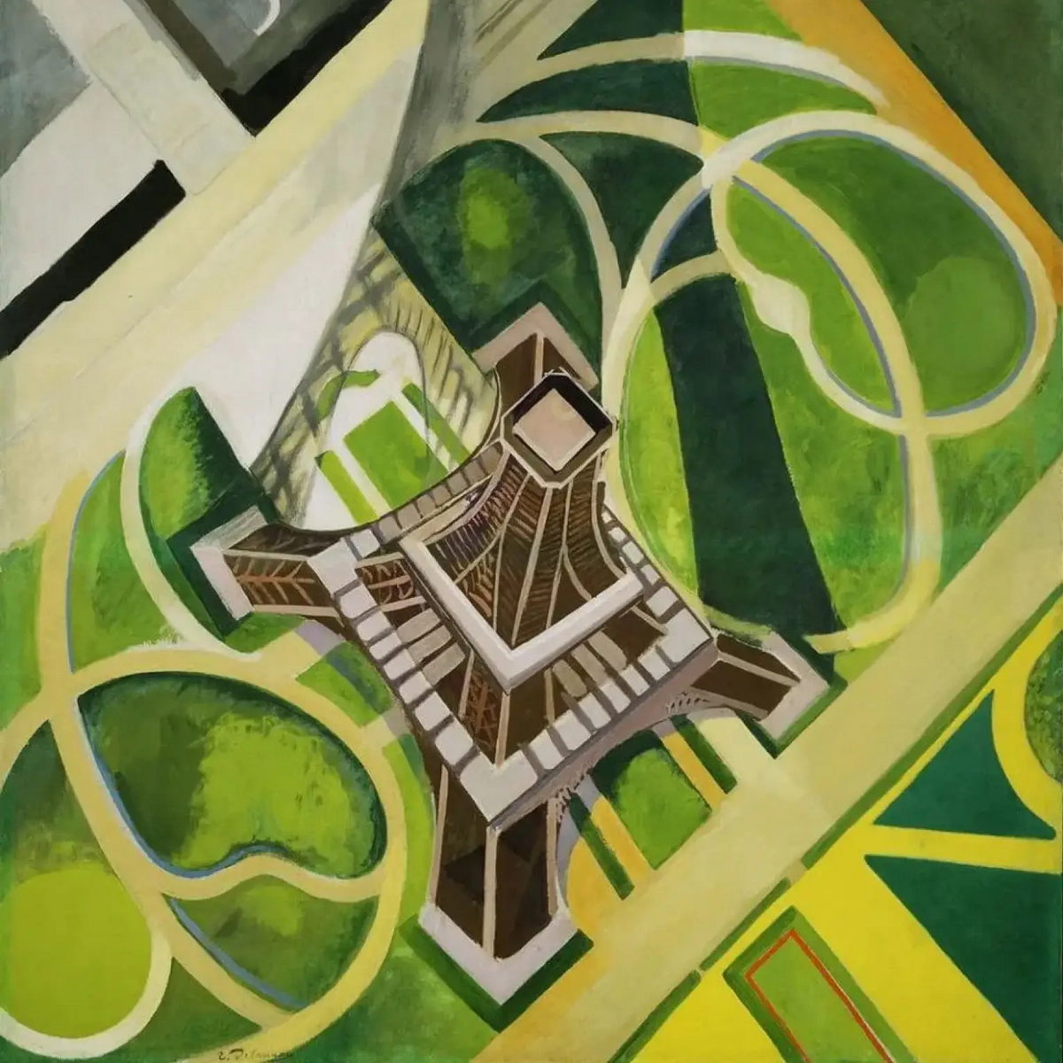 A unique aerial view of the Eiffel Tower by Robert Delaunay. This geometric and colorful painting captures Paris from a modern perspective.