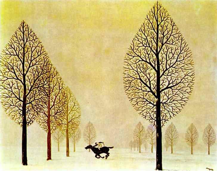 A key work of surrealism by René Magritte. Hand-painted oil reproduction of The Lost Jockey, a dreamlike and mysterious scene for your decoration.
