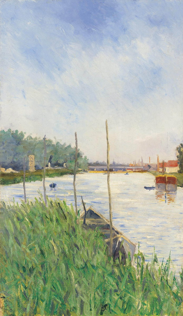 Reproduction of The Seine at Asnières, a verdant Pointillist landscape by Signac.