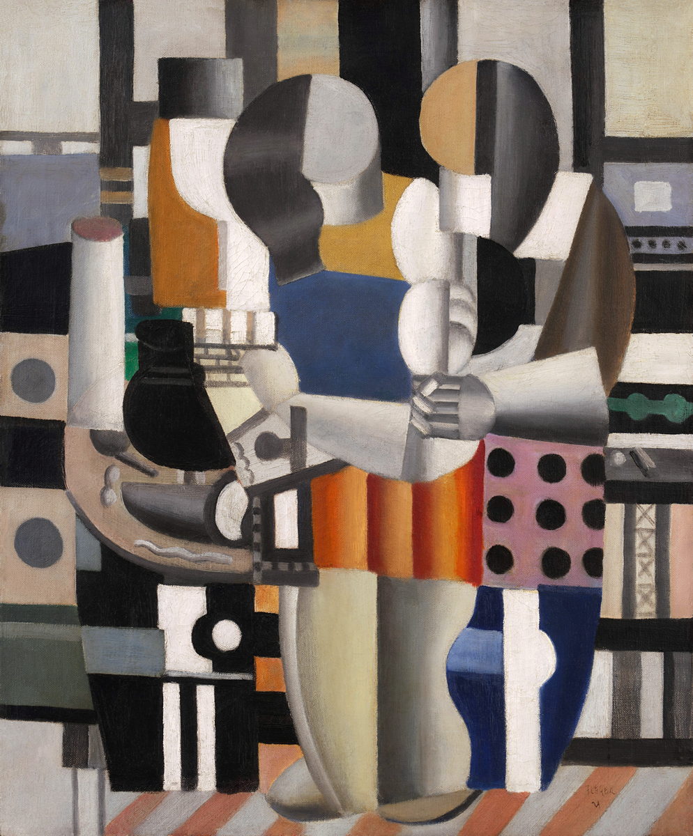 Reproduction of “The Three Figures” (1921) by Fernand Léger. A complex Purist still life, balancing objects and abstract figures.