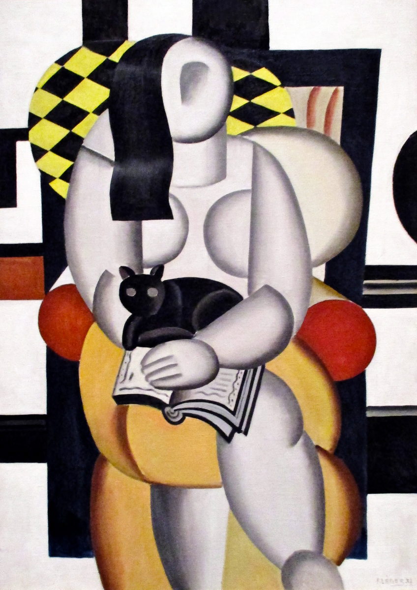 Reproduction of “Woman with a Cat” (1921) by Fernand Léger. A Purist and Cubist portrait of a woman and her cat, in black, white, and yellow.